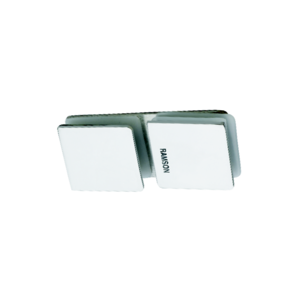 RAMSON Glass to Glass 180° Connector, made from Full Polished Stainless Steel with a Glossy finish. Designed to join two glass panels in a straight line at $180^\circ$. Suitable for $3 \text{mm}$ glass. Unit price: ₹235/-.